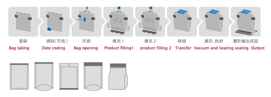 Daloy ng trabaho: bagging → petsa ng paggawa ng pag-print → pagbubukas ng bag → pagpuno 1 → pagpuno 2 → bakante → heat sealing → paghubog at output