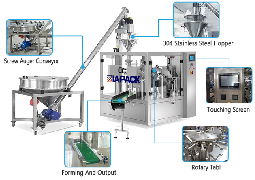 Nilagyan ng Augur Filler at Screw Elevator, malawak itong inilalapat sa packing powder, tulad ng detergent powder, gatas na pulbos, harina, spice, coco powder, ground coffee, at iba pa.